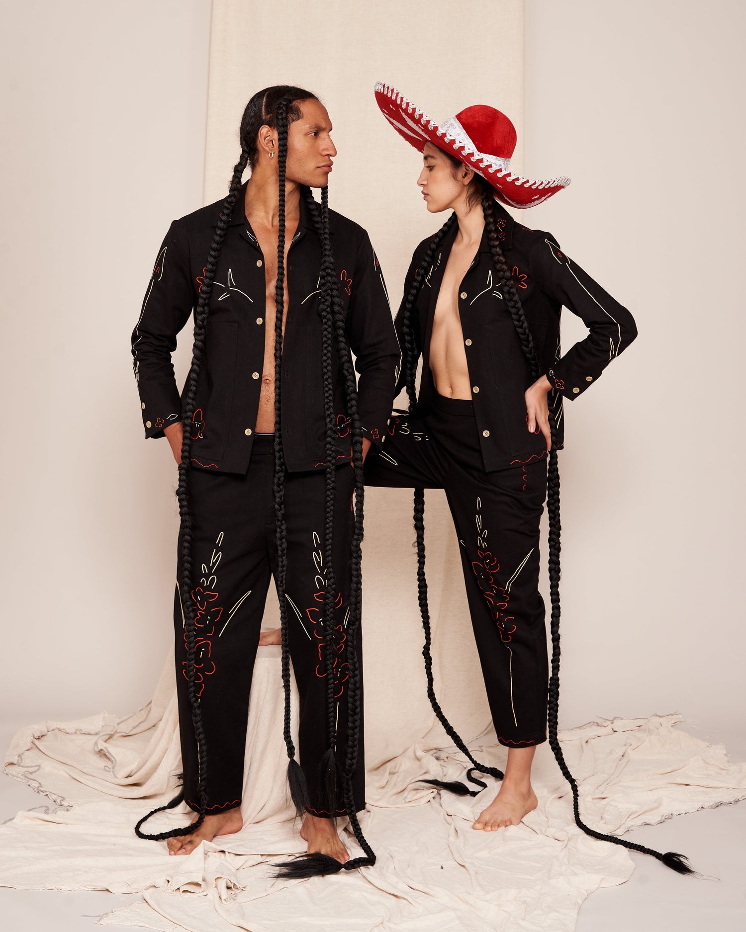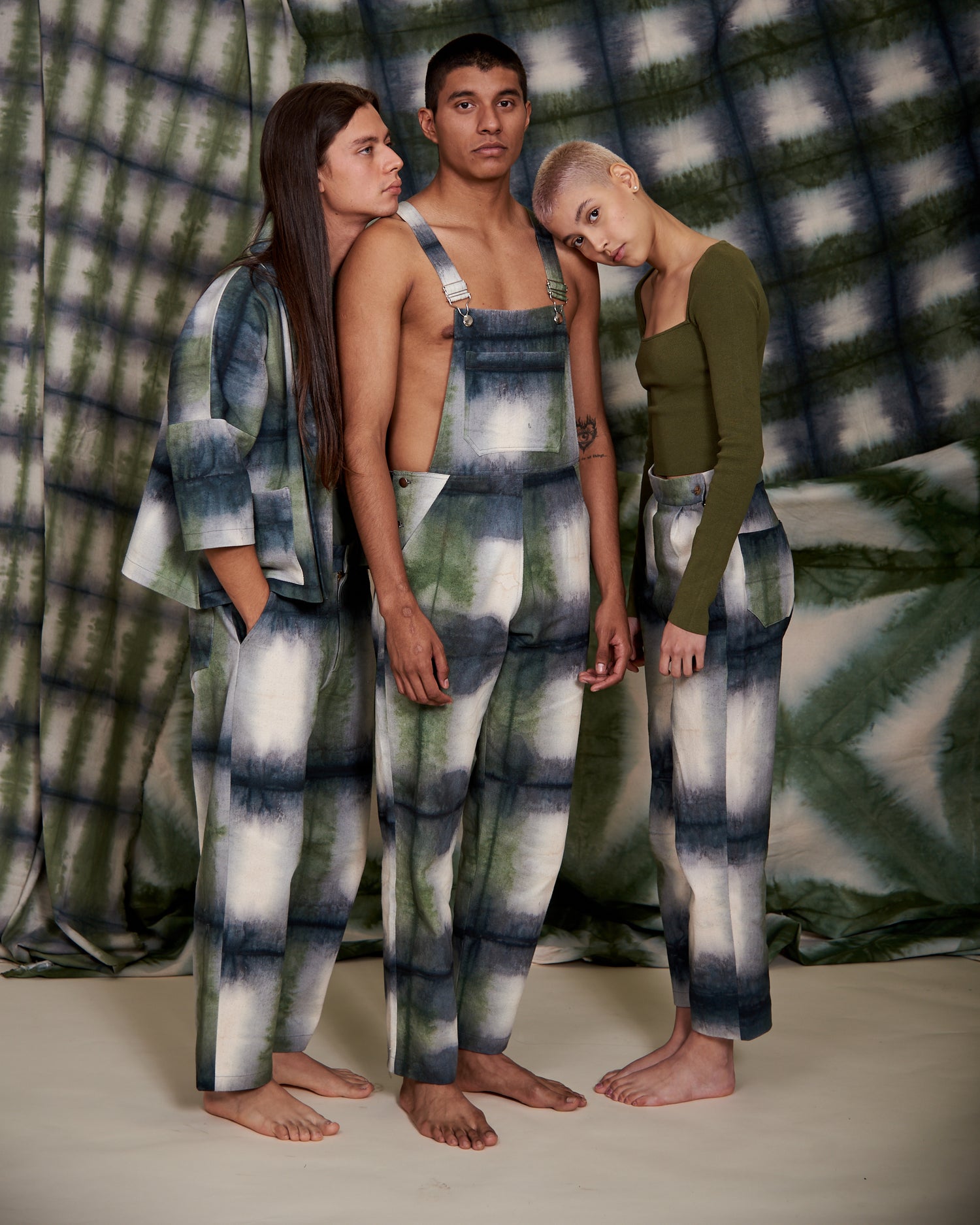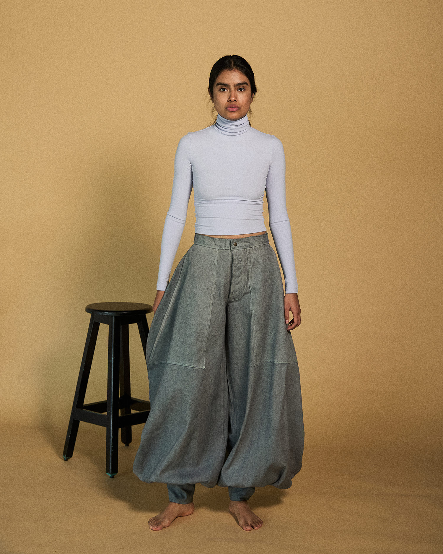 son piezas que habitan entre la indumentaria, el objeto textil y la obra artística. El uso de materiales como la mezclilla cruda ha definido su identidad técnica, permitiendo procesos complejos de teñido.