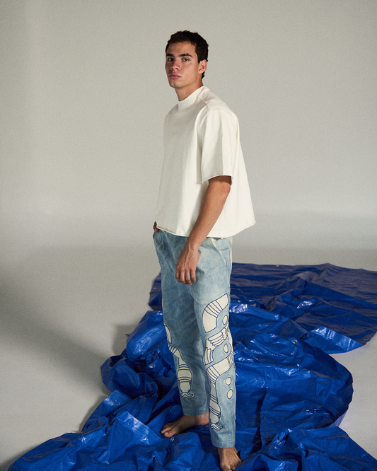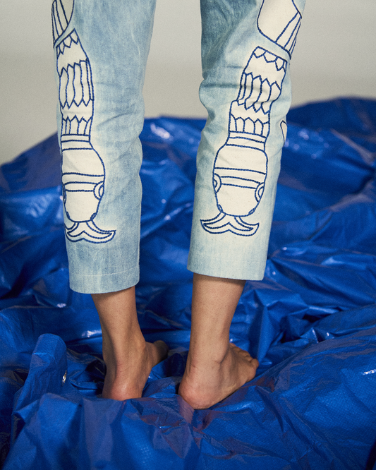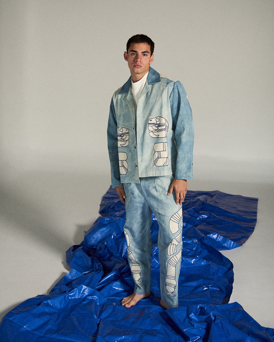 Cada prenda honra la tradición del teñido natural y el bordado artesanal, transformando la indumentaria en un acto devocional que dialoga entre lo sagrado y lo cotidiano.