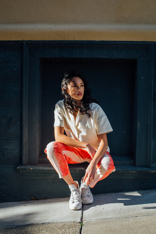 This collection was dyed mainly with bark from the Quina and Palo Brasil trees, and the worker jacket and the extra-long dress were added to the repertoire of pieces.
