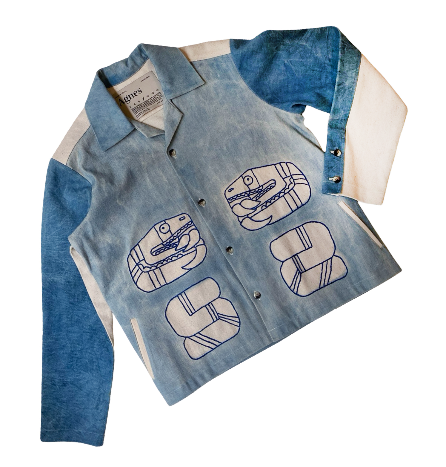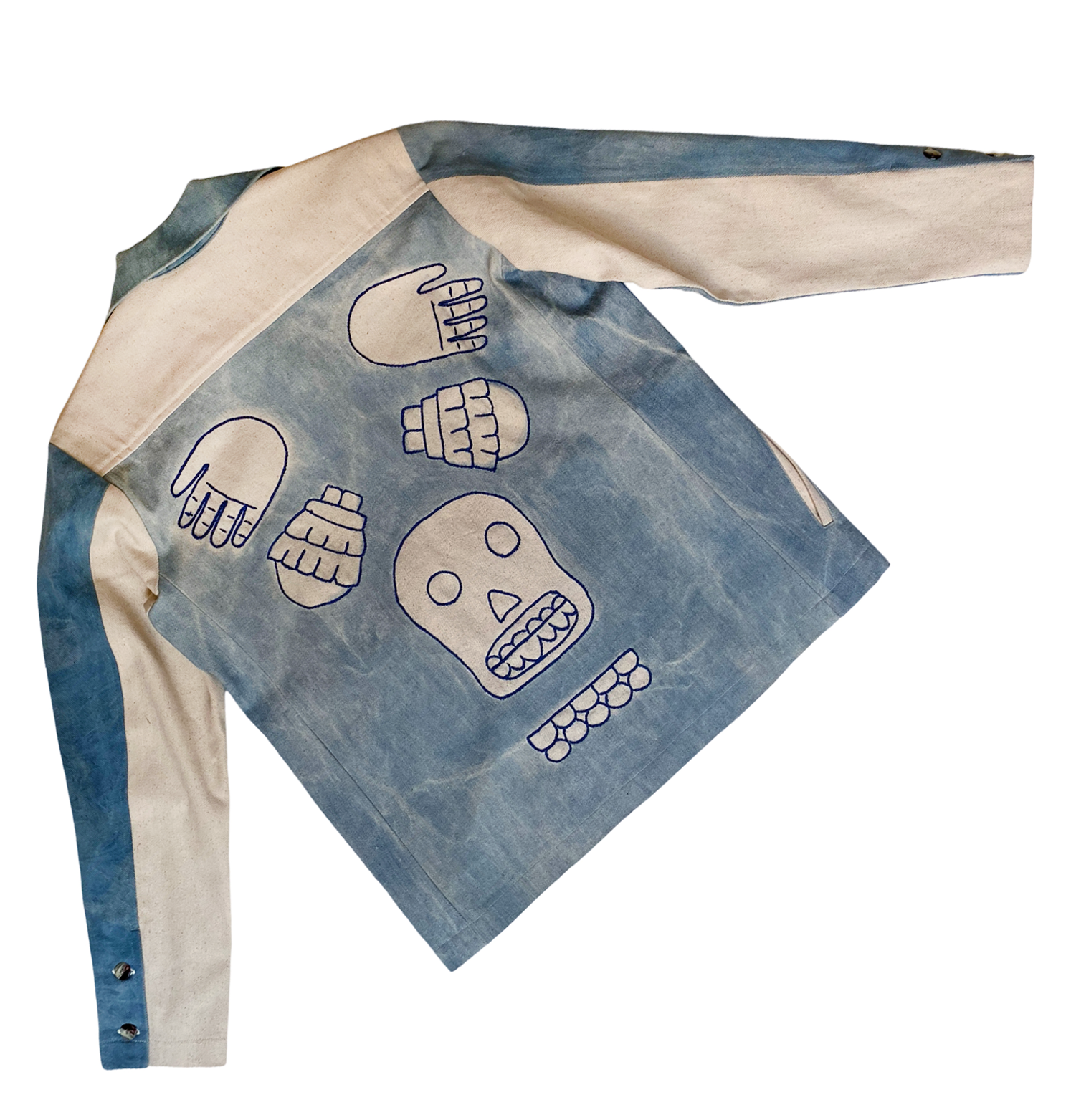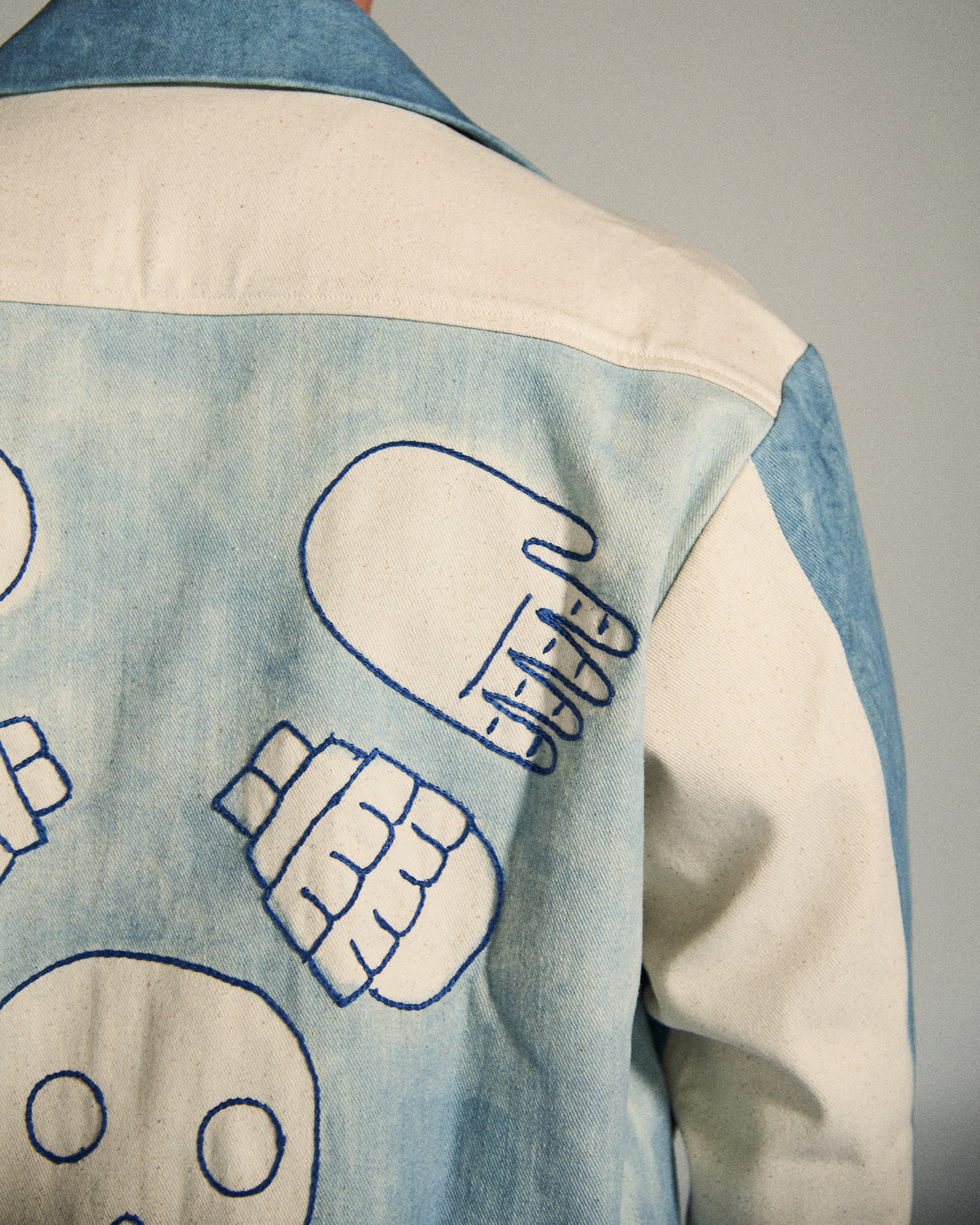 Worker jacket with maxi pockets made of 100% cotton black denim hand-embroidered by Jauja with illustrations with illustrations inspired by Agnes Waterhouse, a woman to whom we pay tribute with the name of our brand, a healer and botanist accused of witchcraft made by the extraordinary Xian of the Death It takes 10 hours to hand embroider this garment.