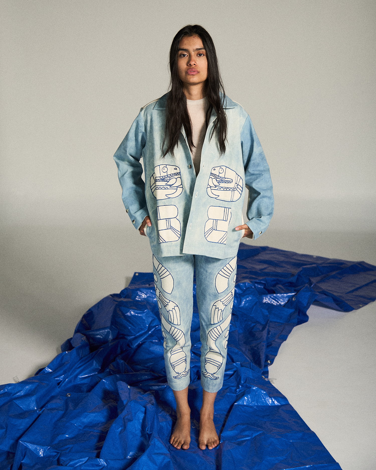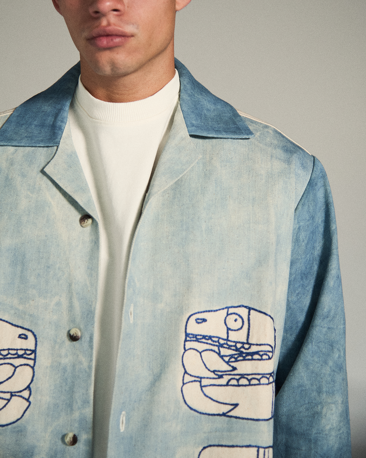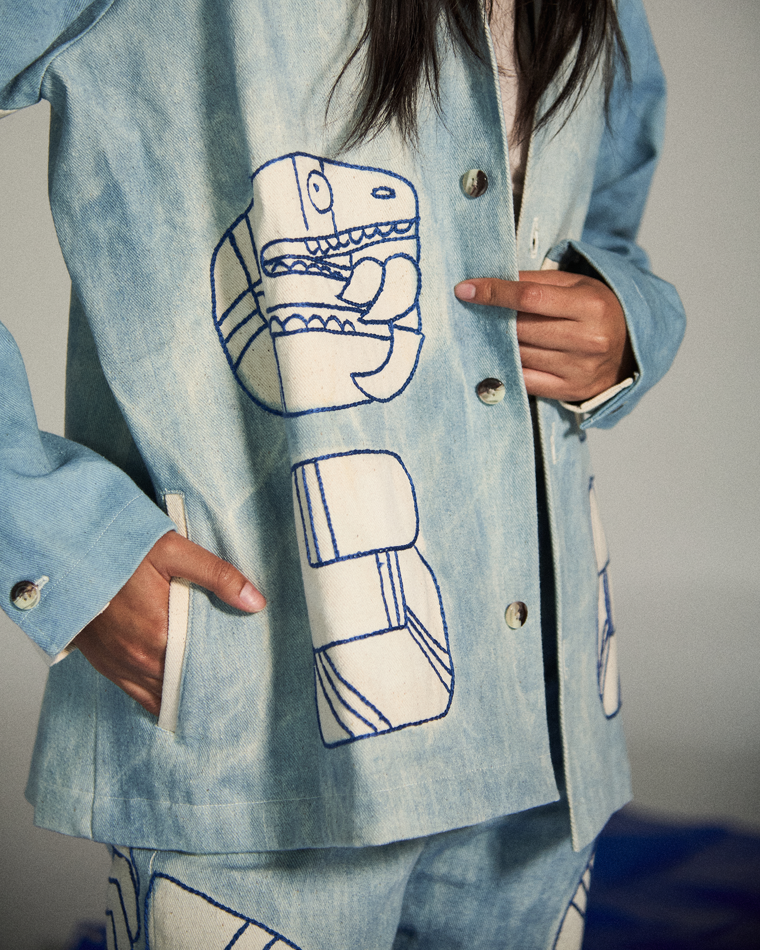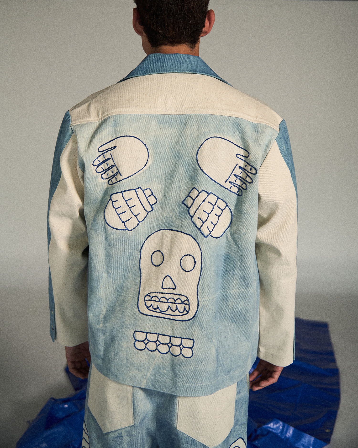 Worker jacket with maxi pockets made of 100% cotton black denim hand-embroidered by Jauja with illustrations with illustrations inspired by Agnes Waterhouse, a woman to whom we pay tribute with the name of our brand, a healer and botanist accused of witchcraft made by the extraordinary Xian of the Death It takes 10 hours to hand embroider this garment.