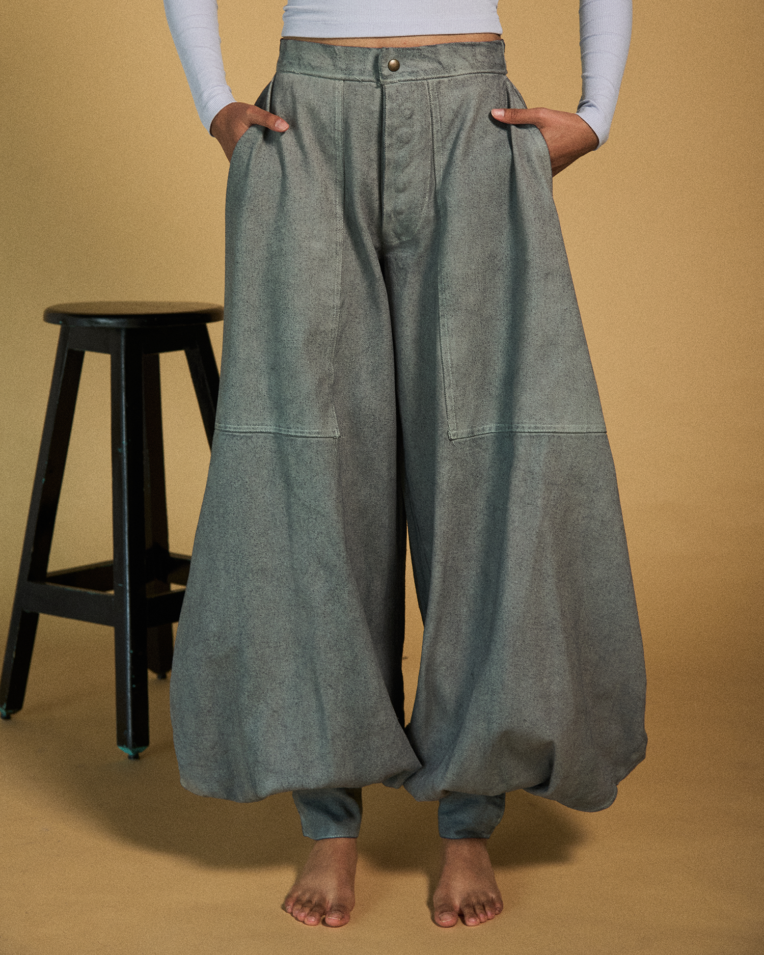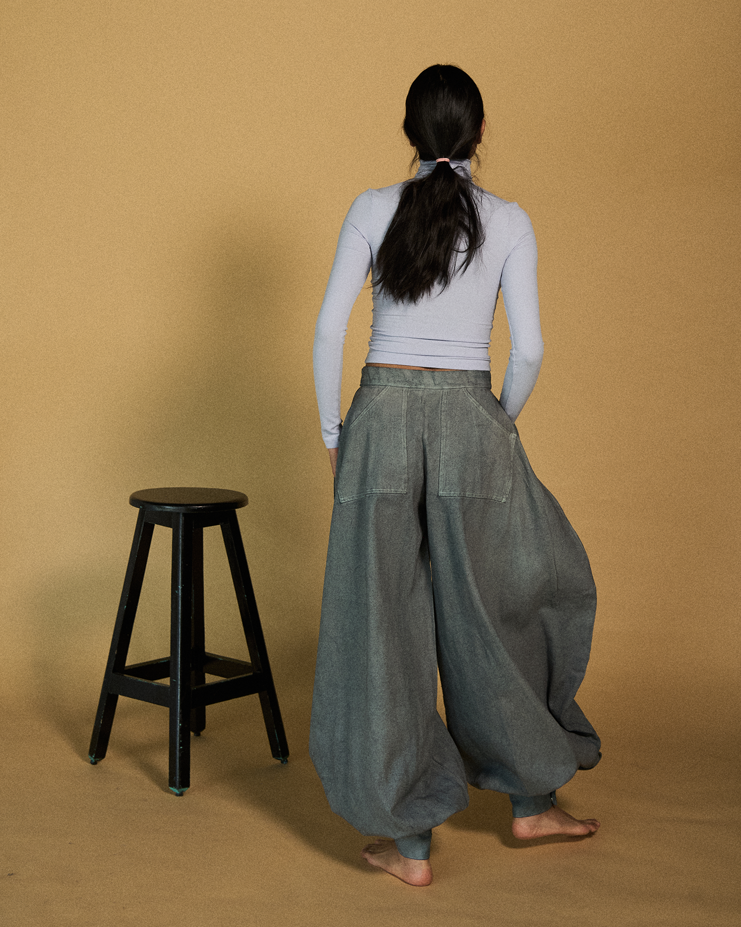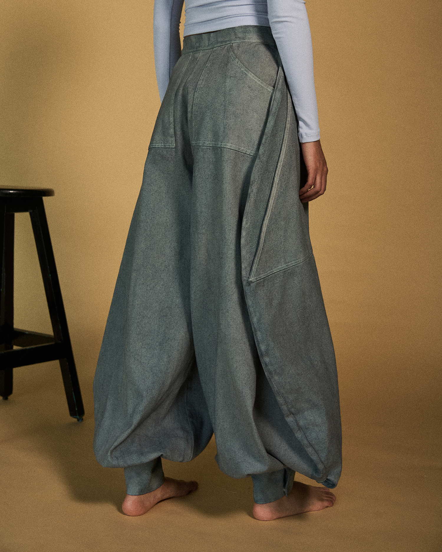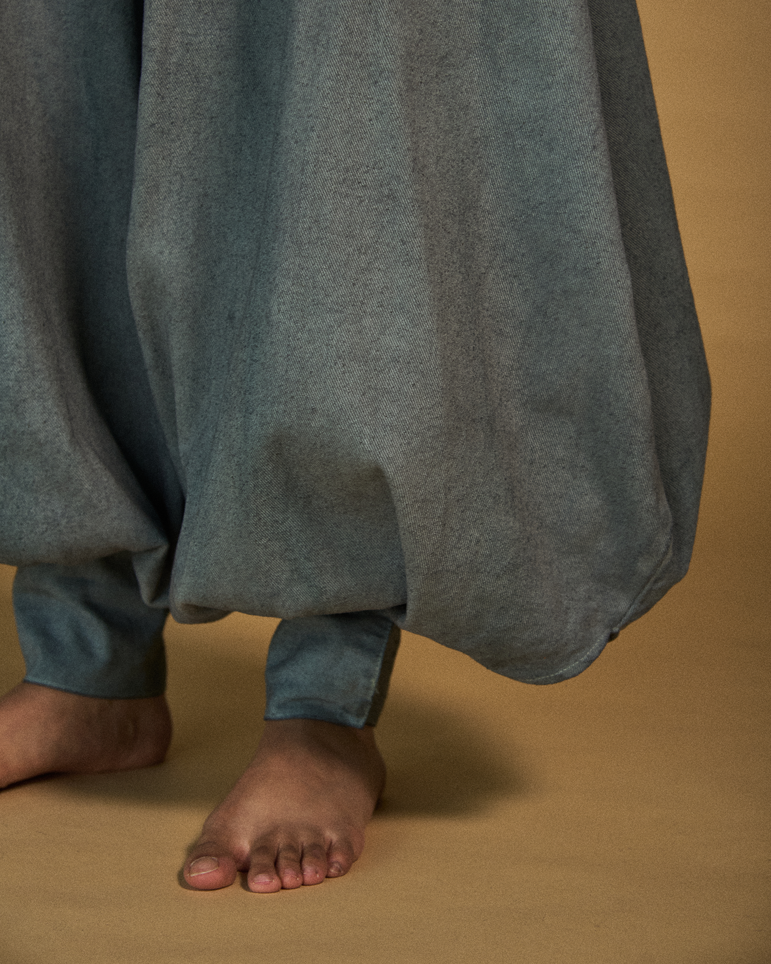 Pantalón de tiro bajo con piernas amplias y puño ajustado al tobillo. Inspirado en la indumentaria de trabajo de la clase obrera japonesa, su construcción privilegia la funcionalidad y la durabilidad.