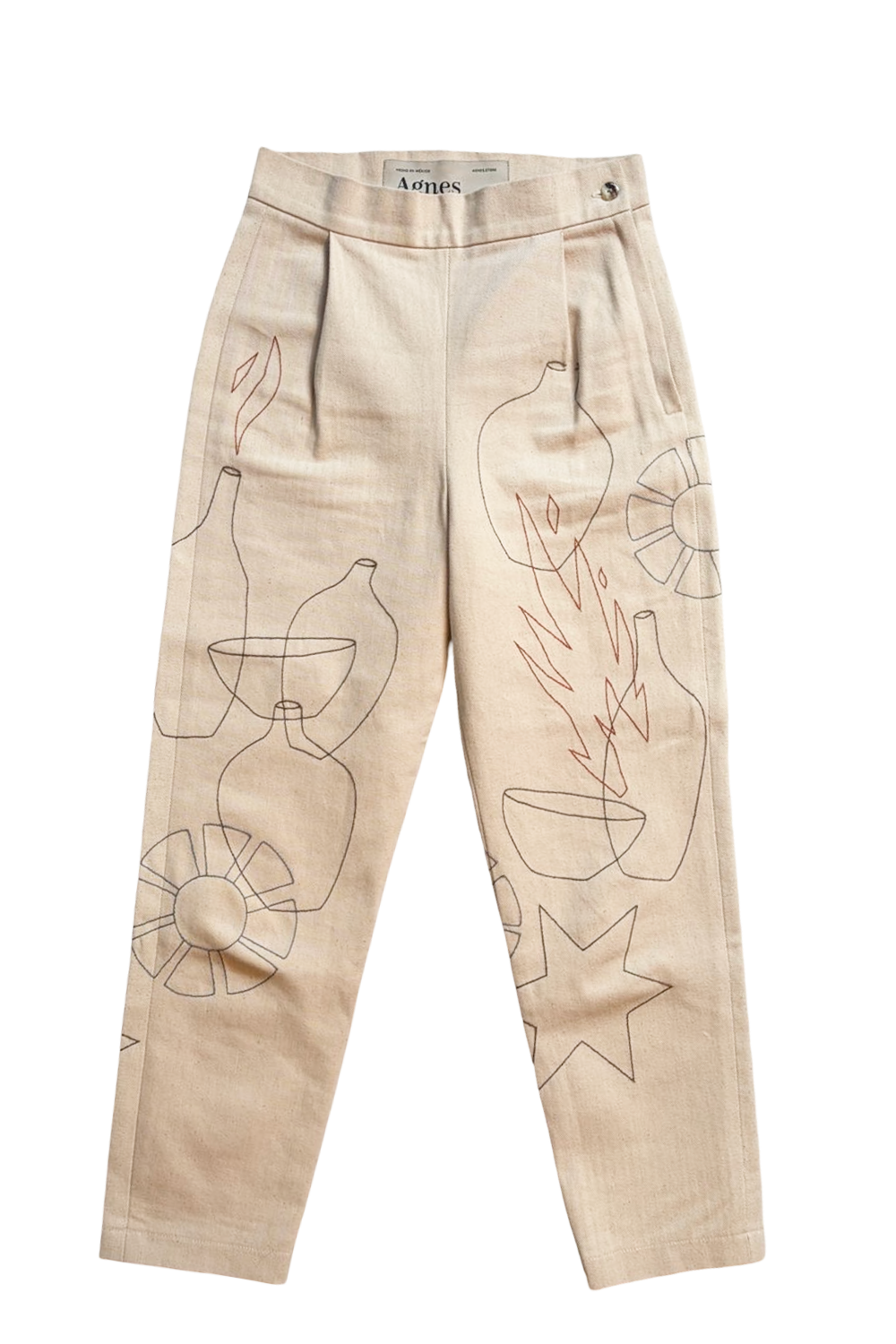 Slack high-waisted con cierre lateral y bolsillos traseros, confeccionado en mezclilla cruda 100% algodón. Bordado a mano por Jauja con ilustraciones inspiradas en Samhain — la fiesta gaélica a medio camino entre el equinoccio de otoño y el solsticio de invierno, con rituales paganos de vasijas, flores y fuego.